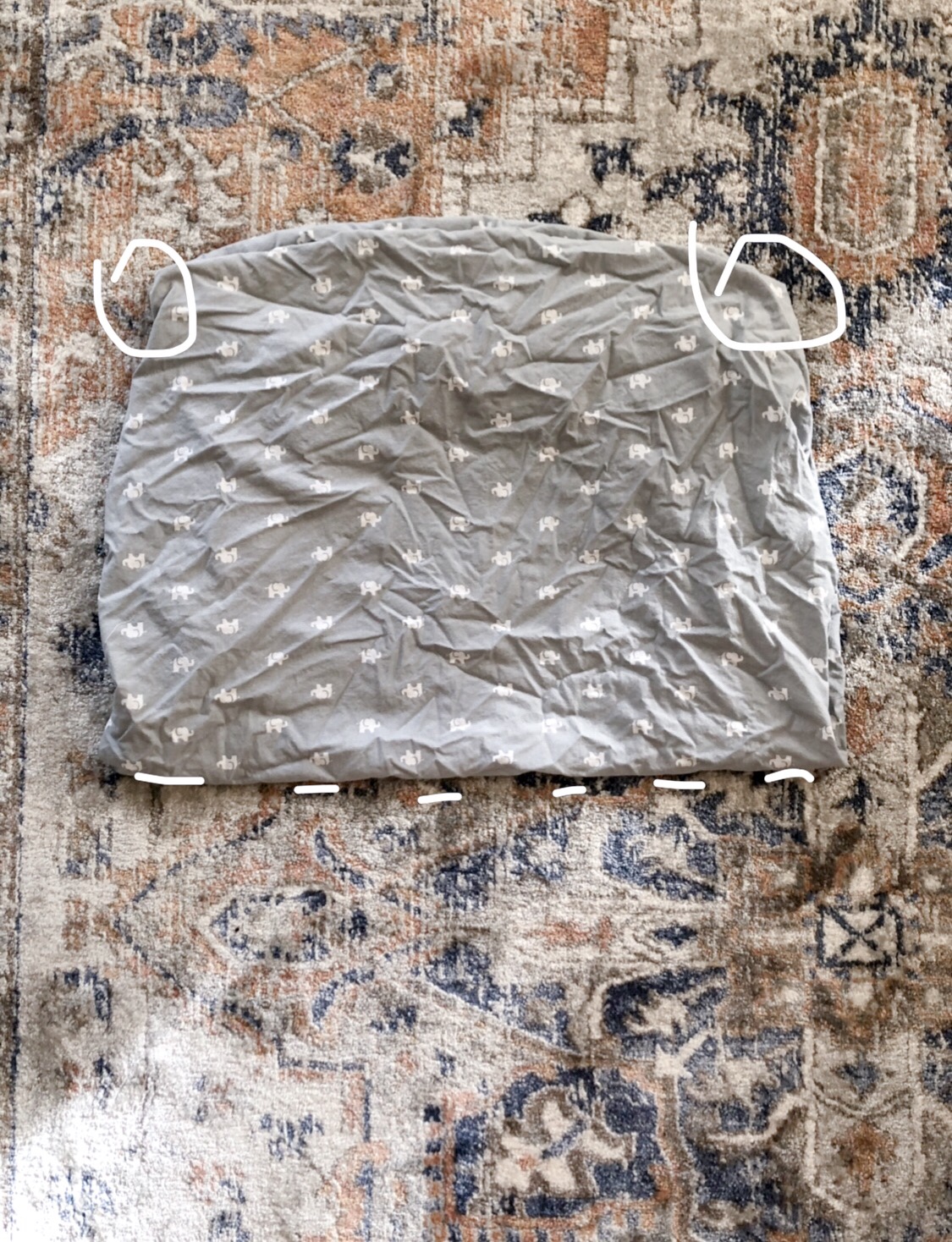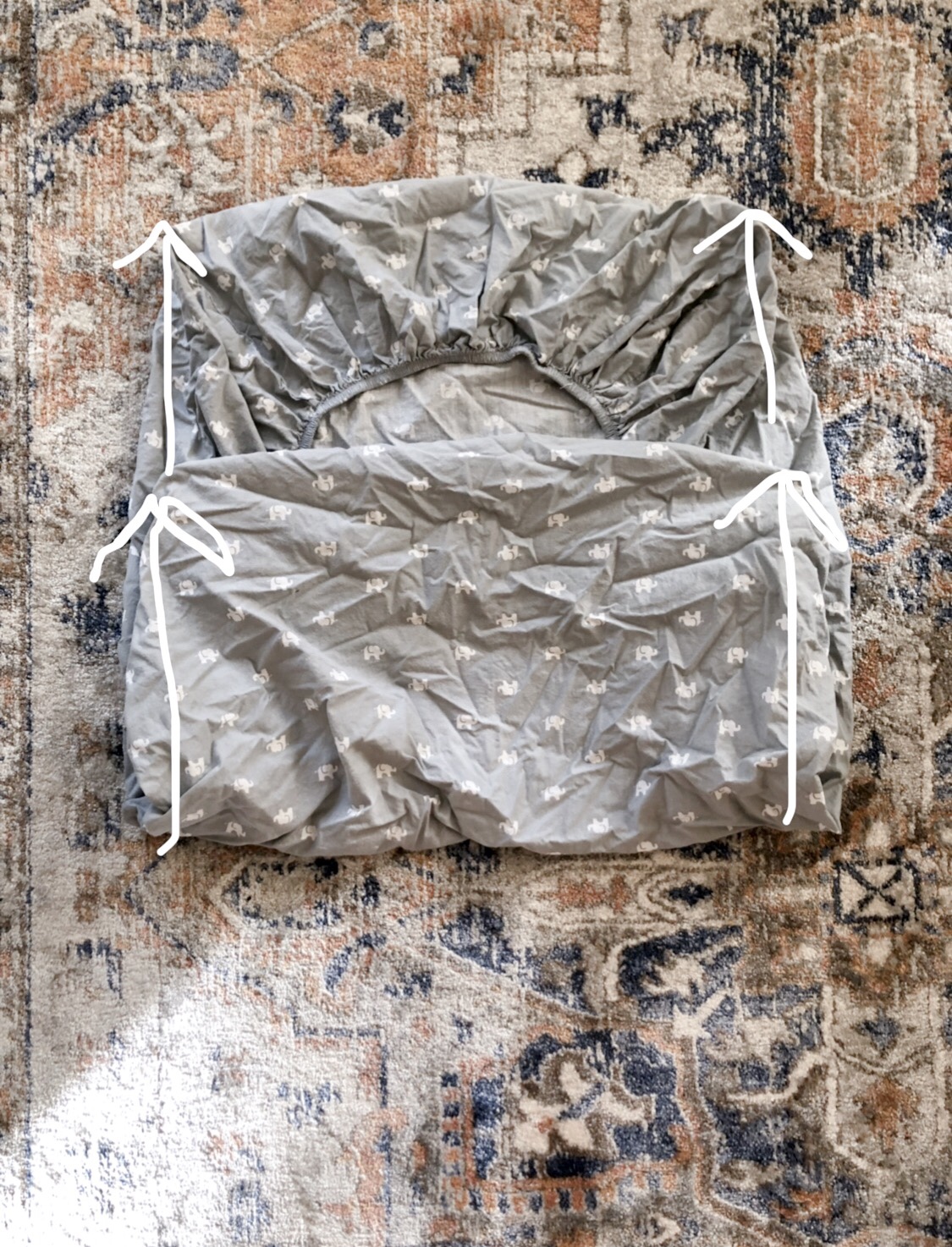 This folding method can be done with ANY size fitted sheet. We chose a crib sheet for ease of taking full length photos, but you can see how I used the same method to fold full-size bed sheets!