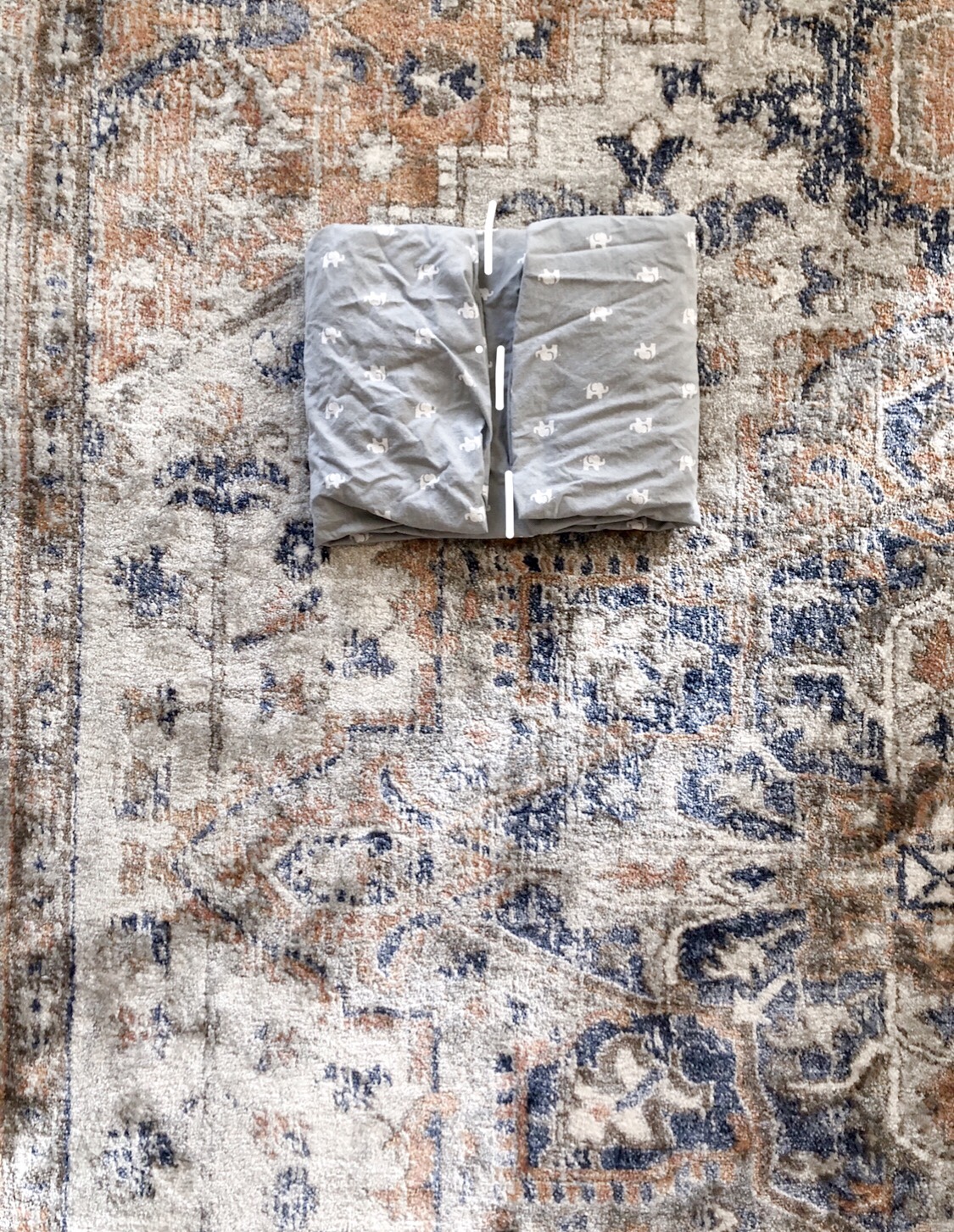 Grab the two bottom corners and walk them up to the top corners. It’s best to do this flat on the floor or on a bed.